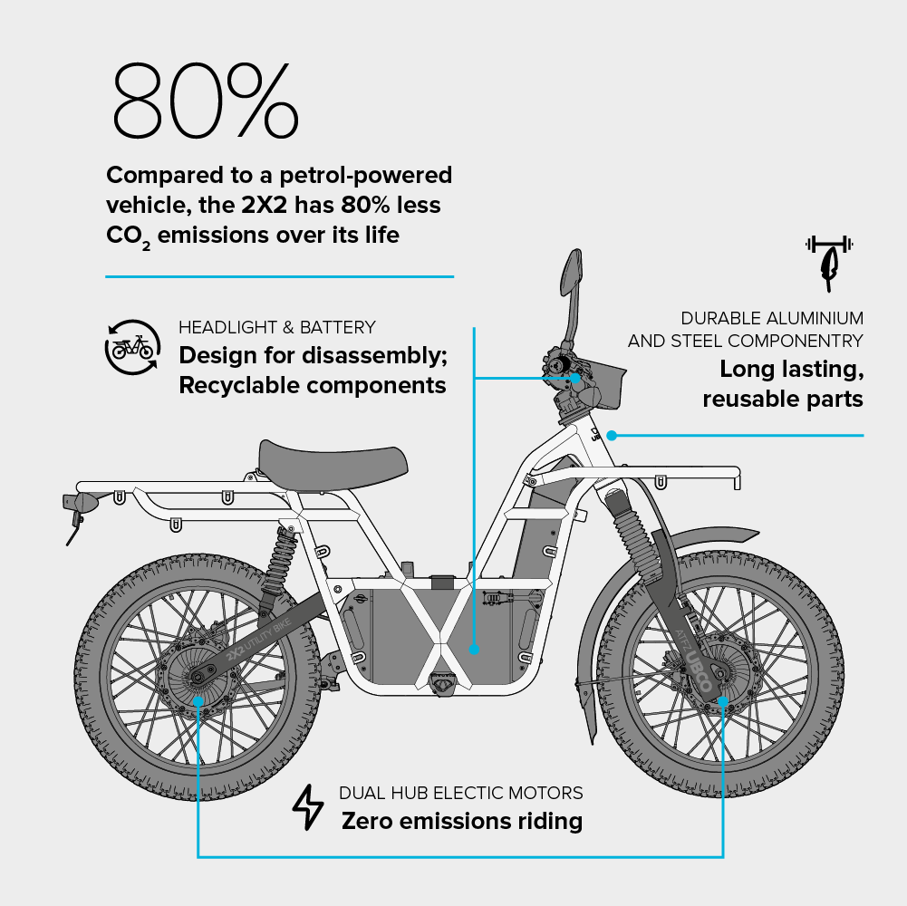 Compared to a petrol bike the 2X2 has 80% less CO₂ emissions during life and removes all particulate emissions during use. You’ll also waste less and spend less on fuel.