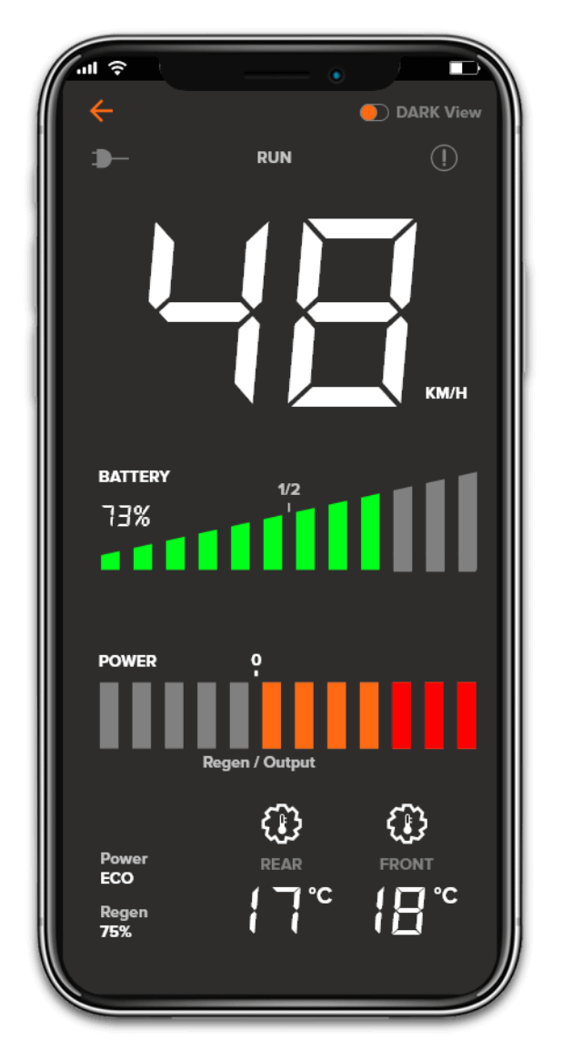 Regenerative braking helps you maintain control and traction with charge recovery to the power supply. Our Quadratic² regen braking system provides independent front and rear control with passive (off throttle) and active (brake activated) regenerative braking. You can even control the level of regen through the UBCO App.